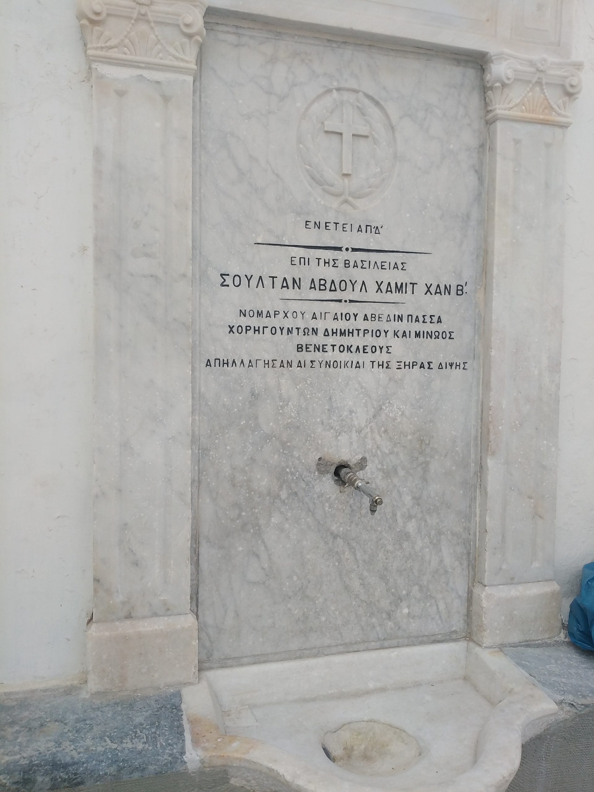 Στο κεντρικό τμήμα της ράχης της κρήνης και κάτωθεν ενός αναγλύφου σταυρού που περιβάλλεται με στεφάνι υπάρχει η εξής εσώγλυφη επιγραφή: