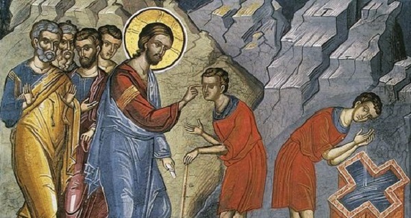 Τῷ καιρῷ ἐκείνῳ, παράγων ὁ ᾿Ιησοῦς, εἶδεν ἄνθρωπον τυφλὸν ἐκ γενετῆς. Καὶ ἠρώτησαν αὐτὸν οἱ μαθηταὶ αὐτοῦ λέγοντες· Ῥαββί, τίς ἥμαρτεν, οὗτος ἢ οἱ γονεῖς αὐτοῦ, ἵνα τυφλὸς γεννηθῇ; Ἀπεκρίθη ᾿Ιησοῦς· οὔτε οὗτος ἥμαρτεν οὕτε οἱ γονεῖς αὐτοῦ, ἀλλ᾿ ἵνα φανερωθῇ τὰ ἔργα τοῦ Θεοῦ ἐν αὐτῷ· Ἐμὲ δεῖ ἐργάζεσθαι τὰ ἔργα τοῦ πέμψαντός με ἕως ἡμέρα ἐστίν· ἔρχεται νὺξ ὅτε οὐδεὶς δύναται ἐργάζεσθαι. Ὅταν ἐν τῷ κόσμῳ ὦ, φῶς εἰμι τοῦ κόσμου. Ταῦτα εἰπὼν ἔπτυσε χαμαὶ καὶ ἐποίησε πηλὸν ἐκ τοῦ πτύσματος καὶ ἐπέχρισε τὸν πηλὸν ἐπί τοὺς ὀφθαλμοὺς τοῦ τυφλοῦ καὶ εἶπεν αὐτῷ· Ὕπαγε νίψαι εἰς τὴν κολυμβήθραν τοῦ Σιλωάμ, ὃ ἑρμηνεύεται ἀπεσταλμένος, Ἀπῆλθεν οὖν καὶ ἐνίψατο, καὶ ἦλθε βλέπων. Οἱ οὖν γείτονες καὶ οἱ θεωροῦντες αὐτὸν τὸ πρότερον ὅτι τυφλὸς ἦν, ἔλεγον· οὐχ οὗτός ἐστιν ὁ καθήμενος καὶ προσαιτῶν; Ἄλλοι ἔλεγον ὅτι οὗτός ἐστιν· ἄλλοι δὲ ὅτι ὅμοιος αὐτῷ ἐστιν.Ἐκεῖνος ἔλεγε ὅτι ἐγώ εἰμι. Ἔλεγον οὖν αὐτῷ· Πῶς ἀνεῴχθησάν σου οἱ ὀφθαλμοί; Ἀπεκρίθη ἐκεῖνος καὶ εἶπεν· ἄνθρωπος λεγόμενος ᾿Ιησοῦς, πηλὸν ἐποίησε, καὶ ἐπέχρισέ μου τοῦς ὀφθαλμοὺς καὶ εἶπέ μοι· Ὕπαγε εἰς τὴν κολυμβήθραν τοῦ Σιλωὰμ καὶ νίψαι· Ἀπελθὼν δὲ νιψάμενος ἀνέβλεψα. Εἶπον οὗν αὐτῷ· ποῦ ἐστιν ἐκείνος; Λέγει· ούκ οἴδα. ῎Αγουσιν αὐτὸν πρὸς τοὺς Φαρισαίους, τόν ποτε τυφλόν. Ἦν δὲ σάββατον, ὅτε τὸν πηλὸν ἐποίησε ὁ ᾿Ιησοῦς, καὶ ἀνέῳξεν αὐτοῦ τοὺς ὀφθαλμούς. Πάλιν οὖν ἠρώτων αὐτὸν καὶ οἱ Φαρισαῖοι, πῶς ἀνέβλεψεν. Ὁ δὲ εἶπεν αὐτοῖς· Πηλὸν ἐπέθηκέ μου ἐπὶ τοὺς ὀφθαλμούς, καὶ ἐνιψάμην, καὶ βλέπω. Ἔλεγον οὖν ἐκ τῶν Φαρισαίων τινές· Οὗτος ὁ ἄνθρωπος οὐκ ἔστι παρὰ τοῦ Θεοῦ, ὅτι τὸ Σάββατον οὐ τηρεῖ. Ἄλλοι ἔλεγον· Πῶς δύναται ἄνθρωπος ἁμαρτωλὸς τοιαῦτα σημεῖα ποιεῖν; Καὶ σχίσμα ἦν ἐν αὐτοῖς. Λέγουσι τῷ τυφλῷ πάλιν· Σὺ τί λέγεις περὶ αὐτοῦ, ὅτι ἤνοιξέ σου τοὺς ὀφθαλμούς; Ὁ δὲ εἶπεν Ὅτι προφήτης ἐστίν. Οὐκ ἐπίστευσαν οὖν οἱ ᾿Ιουδαῖοι περὶ αὐτοῦ ὅτι τυφλὸς ἦν καὶ ἀνέβλεψεν, ἕως ὅτου ἐφώνησαν τοὺς γονεῖς αὐτοῦ τοῦ ἀναβλέψαντος καὶ ἠρώτησαν αὐτοὺς λέγοντες· Οὗτός ἐστιν ὁ υἱὸς ὑμῶν, ὃν ὑμεῖς λέγετε ὅτι τυφλὸς ἐγεννήθη; πῶς οὖν ἄρτι βλέπει; Ἀπεκρίθησαν δὲ αὐτοῖς οἱ γονεῖς αὐτοῦ καὶ εἶπον· Οἴδαμεν ὅτι οὗτός ἐστιν ὁ υἱὸς ἡμῶν, καί ὅτι τυφλὸς ἐγεννήθη· πῶς δὲ νῦν βλέπει οὐκ οἴδαμεν· ἢ τίς ἤνοιξεν αὐτοῦ τοὺς ὀφθαλμοὺς, ἡμεῖς οὐκ οἴδαμεν· αὐτὸς ἡλικίαν ἔχει, αὐτὸν ἐρωτήσατε, αὐτὸς περὶ ἑαυτοῦ λαλήσει. Ταῦτα εἶπον οἱ γονεῖς αὐτοῦ, ὅτι ἐφοβοῦντο τοὺς ᾿Ιουδαίους· ἤδη γὰρ συνετέθειντο οἱ ᾿Ιουδαῖοι ἵνα, ἐάν τις αὐτὸν ὁμολογήσῃ Χριστόν, ἀποσυνάγωγος γένηται. Διὰ τοῦτο οἱ γονεῖς αὐτοῦ εἶπον· Ὅτι ἡλικίαν ἔχει, αὐτὸν ἐρωτήσατε. Ἐφώνησαν οὖν ἐκ δευτέρου τὸν ἄνθρωπον ὃς ἦν τυφλός, καὶ εἶπον αὐτῷ· δὸς δόξαν τῷ Θεῷ· ἡμεῖς οἴδαμεν ὅτι ὁ ἄνθρωπος οὗτος ἁμαρτωλός ἐστιν. Ἀπεκρίθη οὖν ἐκεῖνος, καὶ εἶπεν· Εἰ ἁμαρτωλός ἐστιν, οὐκ οἶδα· ἓν οἶδα, ὅτι, τυφλὸς ὢν, ἄρτι βλέπω, Εἶπον δὲ αὐτῷ πάλιν· Τί ἐποίησέ σοι; πῶς ἤνοιξέ σου τοὺς ὀφθαλμούς; Ἀπεκρίθη αὐτοῖς· Εἶπον ὑμῖν ἤδη, καὶ οὐκ ἠκούσατε· τί πάλιν θέλετε ἀκούειν; μὴ καὶ ὑμεῖς θέλετε αὐτοῦ μαθηταὶ γενέσθαι; Ἐλοιδόρησαν αὐτὸν καὶ εἶπον· Σὺ εἶ μαθητὴς ἐκείνου· ἡμεῖς δὲ τοῦ Μωϋσέως ἐσμὲν μαθηταί. Ἡμεῖς οἴδαμεν, ὅτι Μωϋσεῖ λελάληκεν ὁ Θεός