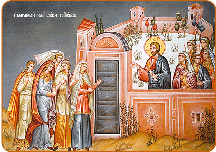 «Την ημέραν εκείνην την φοβεράν, εννοούσα ψυχή μου, ΓΡΗΓΟΡΗΣΟΝ, ανάπτουσα λαμπάδα σου, εν ελαίω φαιδρύνουσα, ου γαρ οίδας πότε, προς σε επελεύσεται, η φωνή η λέγουσα, Ιδού ο Νυμφίος σου. Βλέπε ουν ψυχή μου, μη νυστάξης και μείνεις έξωθεν κρούουσα, ως αι πέντε Παρθένοι, αλλ’ αγρύπνως καρτέρησον, ίνα απαντήσης Χριστώ τω Θεώ, εν ελαίω πίονι, και δώη σοι τον Νυμφώνα, τον θείον της δόξης αυτού»