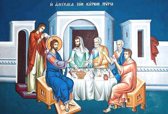 Σήμερον ὁ Χριστός ἔρχεται στήν οἰκία τοῦ Φαρισαίου καί γυναίκα ἁμαρτωλή, προσελθοῦσα, κυλιόταν στά πόδια του, λέγουσα: Κοίταξε, Κύριε, αὐτή πού εἶναι βυθισμένη στήν ἁμαρτία, τήν ἀπελπισμένη γιά τ᾽ἁμαρτωλά ἔργα της, τήν ὁποία ὅμως δέ βδελύχτηκε ἡ ἀγαθότητά σου· καί δῶσε μου τήν ἄφεση τῶν ἁμαρτημάτων μου καί σῶσε με.