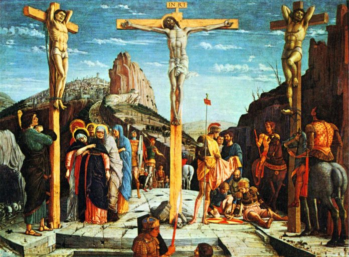 Μετά, φορώντας πάλι τα ρούχα του και βαστάζοντας το Σταυρό, πηγαίνει προς τον Γολγοθά, τον τόπο της καταδίκης και εκεί, γύρω στην Τρίτη ώρα της ημέρας, σταυρώνεται μεταξύ δυο ληστών, βλασφημείται από αυτούς που είχαν πάει στον Γολγοθά μαζί του, μυκτηρίζεται από τους αρχιερείς, ποτίζεται από τους στρατιώτες με ξύδι ανακατεμένο με χολή.