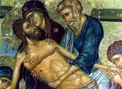 Εσένα, που το φως φοράς σαν ιμάτιο, όταν κατέβασε από τον Σταυρό ο Ιωσήφ μαζί με τον Νικόδημο και (σε) αντίκρισε νεκρό, γυμνό, άταφο, άρχισε ευσυμπάθητο θρήνο και έλεγε οδυρόμενος: “Αλίμονο γλυκύτατε Ιησού, που, πριν λίγο, επειδή (σε) είδε ο ήλιος να κρέμεσαι στον Σταυρό, τυλίχθηκε με σκοτάδι και η γη από τον φόβο εσείετο και σκιζόταν το καταπέτασμα του ναού.