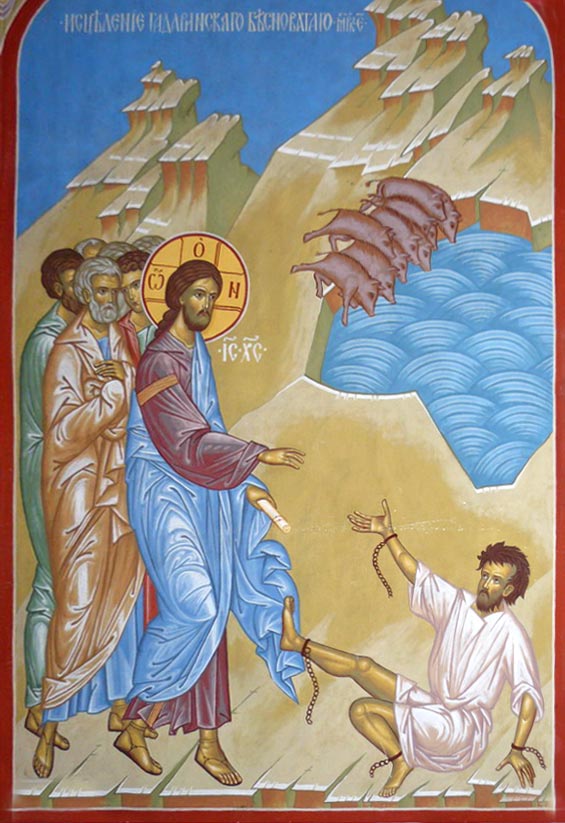 Χωρὶς Ἐκεῖνος νὰ τοὺς πεῖ τίποτα ἢ νὰ προβεῖ σὲ κάποια ἐνέργεια, ἀναστατώθηκαν καὶ ἄρχισαν νὰ κραυγάζουν ἀπεγνωσμένα. Ἀναγνώρισαν τὸν Ἰησοῦ ὡς Υἱὸ τοῦ Θεοῦ καὶ ὑποτάχθηκαν στὴν ἡγεμονικὴ κυριαρχία Του.