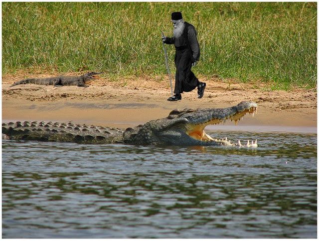 Ο Ηγούμενος έδωσε την ευλογία του και ο ασκητής πήρε τον αδελφό του και ξεκίνησαν. Στον δρόμο συνάντησαν ένα ποτάμι με πολλούς κροκοδείλους. Ήταν η πιο κατάλληλη ευκαιρία, για να υποβάλει τον αδελφό του στην δοκιμασία που ήθελε.