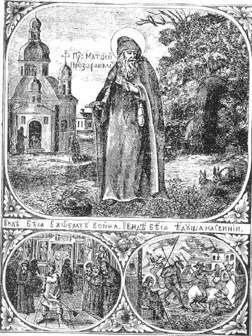 Διότι όπως ο ιερός ευαγγελιστής Ματθαίος απελευθέρωσε με το κήρυγμα και τη διδασκαλία του το λαό της Αιθιοπίας από την πλάνη των δαιμόνων, έτσι και ο προορατικός Ματθαίος, με τη σκληρή του άσκηση στη μονή των Σπηλαίων, έλαβε από τον Κύριο το χάρισμα ν’ απελευθερώνει το λαό της Ρωσίας από τις δαιμονικές πλεκτάνες.