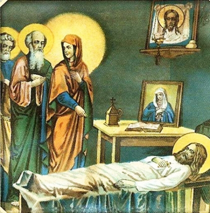 Ενώ λοιπόν τότε αγρυπνούσε γι’ αυτή την αλήθεια και συλλογιζόταν, του παρουσιάζεται στο ξύπνιο του ένας γηραλέος με ανθρώπινη μορφή, ιεροπρεπής στο ντύσιμό του, που μαρτυρούσε πολλή αρετή με τη χάρη του προσώπου του και την κοσμιότητα της εμφάνισής του.