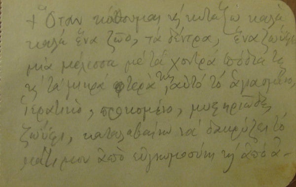 Όταν κάθουμαι και κοιτάζω καλά καλά ένα ζώο, τα δέντρα, ένα ζωύφι, μια μέλισσα με τα χοντρά πόδια και τα μικρά φτερά της, αυτό το αγιασμένο, ιερατικό, προκομμένο μυστηριώδες ζωύφι, καταλαβαίνω να δακρύζει το μάτι μου από ευγνωμοσύνη και από αγάπη για τον Πλαστουργό μας.