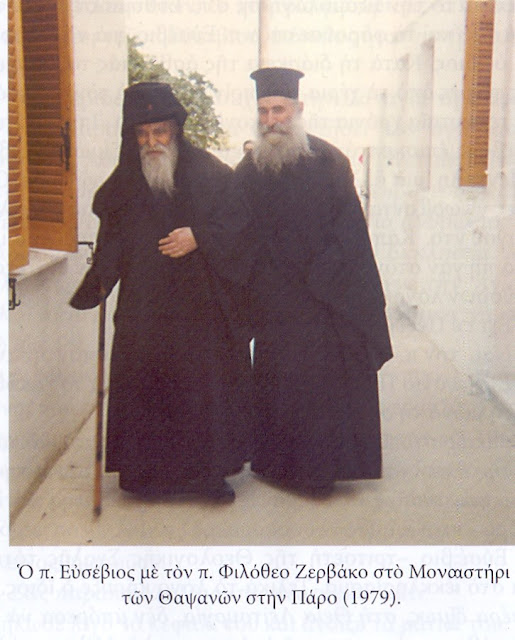 Γέροντας Ευσέβιος Γιαννακάκης, συμπατριώτης του Οσίου Φιλοθέου, είχε γεννηθεί το 1910 στο Γεωργίτσι της Σπάρτης (✞εκοιμήθη στις 19 Ιουνίου 1995)