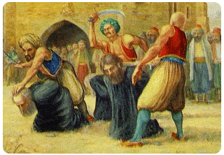 Νέοι ἄνθρωποι, παλληκάρια ἀπάνω στ᾿ ἄνθος τῆς νιότης τους, πηγαίνανε προθυμερὰ νὰ παραδοθοῦνε γιὰ τ᾿ ὄνομα τοῦ Χριστοῦ, κι ἀντὶς ἀρραβωνιάσματα σφαζόντανε σὰν τ᾿ ἀρνιὰ ἡ κρεμαζόντανε μὲ τὴ θελιὰ στὸν λαιμό τους καί, γιὰ νὰ τοὺς τυραγνᾶνε περισσότερο οἱ ἄπιστοι, κόβανε τὸν λαιμό τους σιγὰ -σιγὰ μὲ στομωμένα μαχαίρια ἢ τοὺς χωρίζανε μὲ σάπια σχοινιὰ ποὺ κοβόντανε, γιὰ νὰ τοὺς ξανακρεμάσουνε.