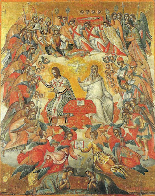 Και όπως προχωρούσε ο λειτουργός λέγοντας τη δέηση (Μεγάλη Είσοδος), έβλεπε ο Όσιος ότι ακολουθούσαν οι Άγγελοι πέριξ της κεφαλής του ιερέως, δύο των Χερουβείμ και δύο των Σεραφείμ, και πήγαιναν μπροστά από τον ιερέα, μαζί με πολλούς άλλους Αγγέλους, χαιρόμενοι αρρήτως.
