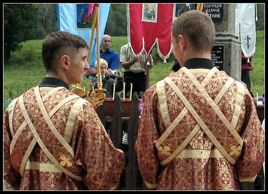 Στις λιτανείες προπορεύεται κρατώντας τον Σταυρό. Ακόμη κρατά το τρικύριο του Βήματος και ετοιμάζει τα φώτα.