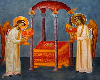 Παράπλευρα έστεκε μια χορωδία με απερίγραπτη ομορφιά. Γινόταν ή θεία λειτουργία. Ολόκληρη. Την τελούσαν άγιοι ιεράρχες. Ιεράρχες σαν τους Βασίλειο, Γρηγόριο και Ιωάννη, σαν τους Αθανάσιο και Κύριλλο, τους οικουμενικούς διδασκάλους.