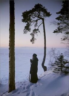 Όταν γύρισε από το δωμάτιο του ο Γέρο – Χερουβείμ, είδε τα πράγματα ξεφορτωμένα αλλά ο ξένος είχε φύγει. Βγήκε έξω προς αναζήτηση του, αλλά δεν είδε τίποτε. Κοιτάζει προσεχτικά στο χιόνι έξω από το Καλύβι του, δεν υπήρχε ίχνος που να φανερώνει πώς πέρασε άνθρωπος, ούτε αχνάρια ζώου και του φάνηκε πολύ περίεργο.