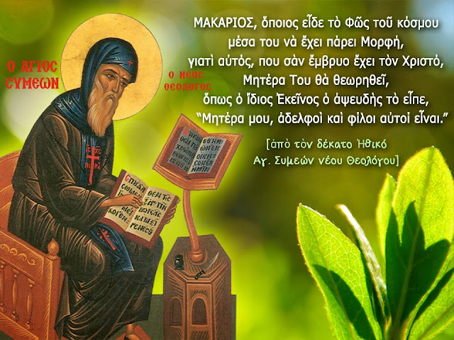 ΜΑΚΑΡΙΟΣ, ὅποιος εἶδε τὸ Φῶς τοῦ κόσμου μέσα του νὰ ἔχει πάρει Μορφή, γιατὶ αὐτός, σὰν ἔμβρυο ἔχοντας τὸν Χριστό, Μητέρα Του θὰ θεωρηθεῖ, ὅπως ὁ ἴδιος Ἐκεῖνος ὁ ἀψευδὴς τὸ εἶπε, “Μητέρα μου ἀδελφοὶ καὶ φίλοι αὐτοί εἶναι.”