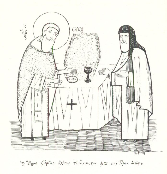 Ο Άγιος Σέργιος του Ραντονέζ βλέπει το Άκτιστο Φως στα Τίμια Δώρα. Σχέδιο του π. Χριστόδουλου Φεργαδιώτη από το βιβλίο του Π. Πάσχου ”Ο Μεγάλος Άγιος της Ρωσίας”, εκδόσεις Ακρίτας.πηγή
