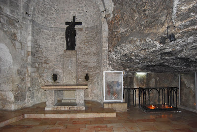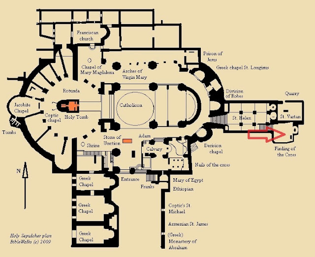 Το Σπήλαιο της Εύρεσης του Τιμίου Σταυρού στον Ναό της Αναστάσεως στα Ιεροσόλυμα(με το κόκκινο βέλος).