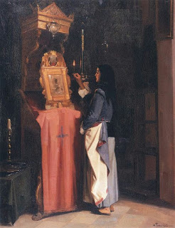Ἡ ἐκκλησιὰ ἦταν σκοτεινὴ καὶ ἔρημη. Τὸ λιγοστὸ φῶς ποὺ ἔμπαινε ἀπὸ τὰ πλαϊνὰ παράθυρα δὲν ἦταν ἀρκετὸ γιὰ νὰ φωτίσει τὸ μέσα μέρος της, στὴ μεριὰ τοῦ τέμπλου. Οὔτε καντήλι οὔτε κερὶ ὑπῆρχε ἀναμμένο. Ποῦ νὰ βρεθεῖ λάδι;