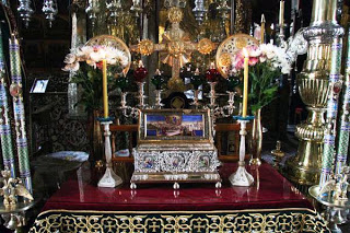 Τότε όλοι, αφού δόξασαν τον Σωτήρα Χριστό και απέδωσαν ευχαριστήριους ύμνους στην Πάναγνο Μητέρα Του, κατέθεσαν την αγία Ζώνη στην Αγία Σορό, στην οποία και προϋπήρχε».