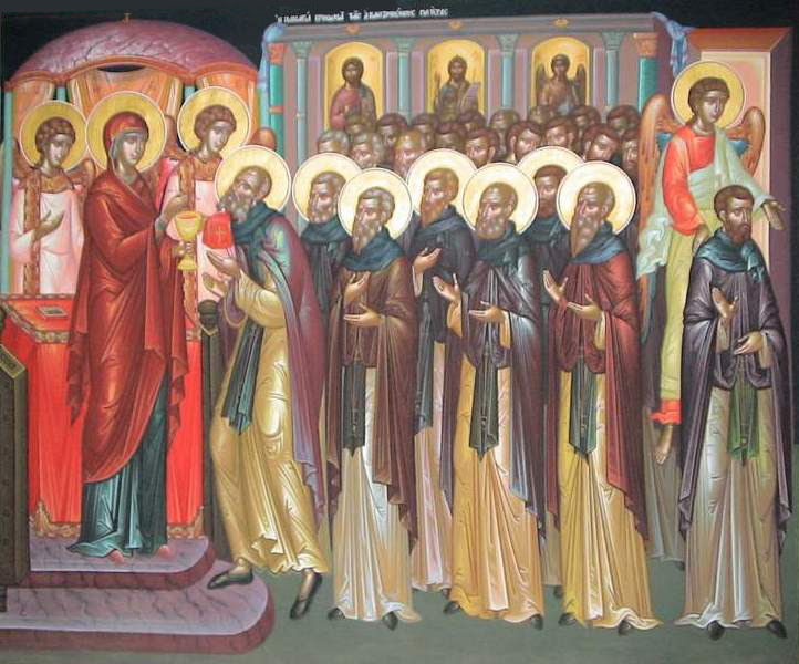 Η δε ωραία εκείνη γυνή, η οποία ήταν η Δέσποινά μας, εβάσταζε μια χρυσή λαβίδα, και ερχόταν προς αυτήν ένας-ένας οι μοναχοί, καθάριζε το πρόσωπό τους ο Άγγελος με το μανδύλιο, έπειτα προσκυνούσε την Παναγία και αυτή λάμβανε τη λαβίδα και του μετέδιδε τον ουράνιο Άρτο.