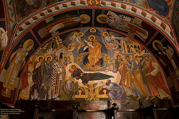 Εορτάζουμε και πανηγυρίζουμε το θάνατό Της, την έξοδό Της από αυτόν τον κόσμο, τον οποίο αποκαλούμε κοίμηση. Με θεσπέσιους ύμνους, ύψιστης θεολογικής και ποιητικής αξίας, με υπέροχες μελωδίες και εγκώμια, με χαρές και αγαλλίαση υμνούμε την έξοδό Της και την εις ουρανούς ανάβασή Της.