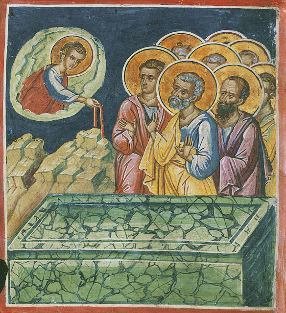 Σύμφωνα με την παράδοση, κατά θείαν οικονομίαν, ο Απόστολος Θωμάς ευρισκόμενος στις Ινδίες δεν ήταν παρών στην κηδεία της Θεομήτορος.