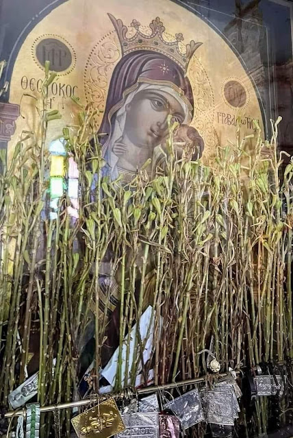 Όταν έλθει ο Μάης και αρχίζουν ν’ ανθίζουν τα κρίνα, τα κόβουν και τα τοποθετούν σε ανθοδέσμες μπροστά στην ιερή και θαυματόβρυτη εικόνα της Παναγίας.