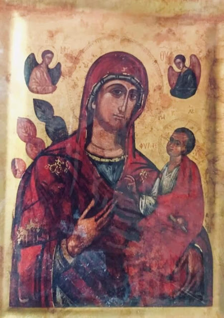 « Αγία Φύλαξη» ευδιάκριτο να πλαισιώνει το φωτοστέφανό Της, στο αγιογραφημένο έργο του 16ου αιώνα.