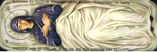 Τότε, ο κορυφαίος των Αποστόλων Πέτρος, άρχισε να εκφωνεί στην Θεοτόκο επιτάφια εγκώμια και οι λοιποί Απόστολοι πήραν το νεκροκρέβατο, ψάλλοντας ύμνους και κρατώντας λαμπάδες, οδήγησαν το θεοδόχο σώμα της Θεομήτορος στον τάφο, στην Γεσθημανή.