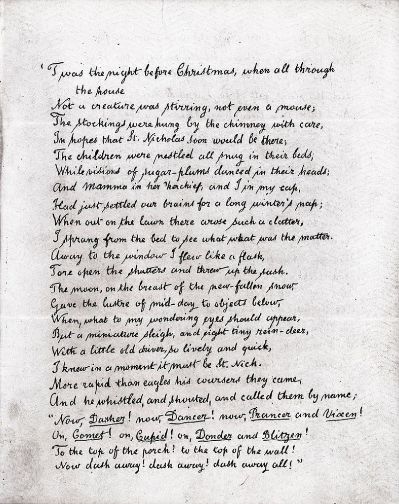 “A Visit from St. Nicholas”, more commonly known as “The Night Before Christmas” and “‘Twas the Night Before Christmas” from its first line, is a poem first published anonymously in 1823 and later attributed to Clement Clarke Moore, who claimed authorship in 1837.