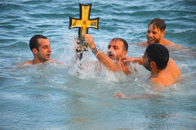 Αράζουν απέναντι από την παραλία που βρίσκεται ο πολύς κόσμος. Τη στιγμή που γίνεται η Βάφτιση αφήνουν περιστέρια, ενώ κάποιοι νεαροί πέφτουν στα κρύα νερά για να πιάσουν τον σταυρό. Παράλληλα, βάρκες, καΐκια και κάθε λογής πλεούμενα σφυρίζουν εις ένδειξη χαράς και συμμετοχής στη μεγάλη γιορτή.