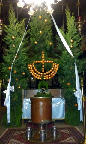 Οι ιερείς και οι επίτροποι καθώς και άλλοι ενορίτες, τρεις μέρες πριν τα Φώτα, φέρνουν και κρεμούν στο κέντρο του ναού ένα μεγάλο κυπαρίσσι. Κάτω από το κυπαρίσσι στήνεται ένα ειδικό τραπέζι και γύρω γύρω στήνονται άλλα τέσσερα μικρότερα κυπαρίσσια.