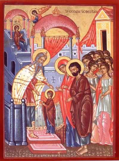 Τώρα όμως ο ιερέας παίρνει από το χέρι τη Μαρία και την οδηγεί στο ιερότερο τμήμα του Ναού και εμείς ψάλλουμε “Ο καθαρώτατος ναός του Σωτήρος…σήμερον εισάγεται εν τω οίκω Κυρίου…”.