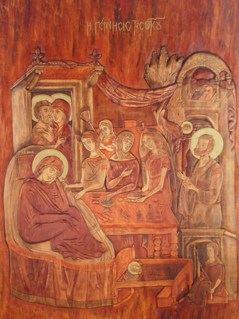 Σήμερον γεννᾶται περιφανῶς, ἐξ ἐπαγγελίας, ἡ Θεόνυμφος Μαριάμ, ἡ προορισθεῖσα, τῷ Λόγῳ πρὸς αἰώνων· ὑμνήσωμεν οὖν πάντες ταύτης τὴν γέννησιν.