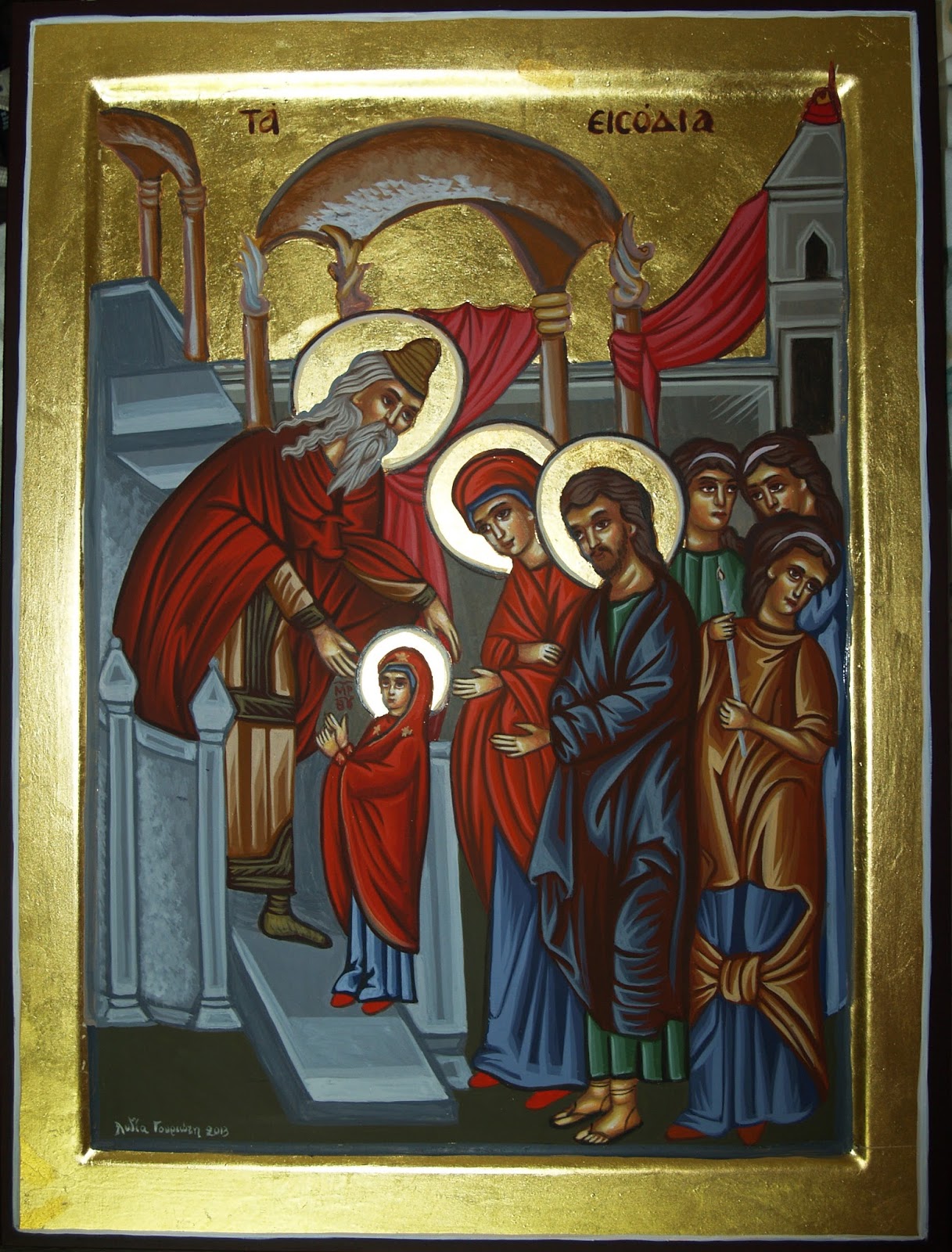 Η είσοδος της Παναγίας μας στο Ναό αποτελεί κορυφαίο γεγονός στο Θεϊκό σχέδιο της σωτηρίας του ανθρώπου. Η Θεοτόκος εισέρχεται στα Άγια των Αγίων, εκεί όπου άπαξ του ενιαυτού εισήρχετο ο Αρχιερεύς για να προσφέρει το θυμίαμα και παραμένει εκεί μέχρι λίγο τον Ευαγγελισμό της, υπό του Αρχαγγέλου Γαβριήλ.