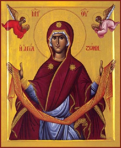 Θεοτόκε ἀειπάρθενε, τῶν ἀνθρώπων ἡ σκέπη, Ἐσθῆτα καὶ Zώνην τοῦ ἀχράντου σου σώματος, κραταιὰν τῇ πόλει σου περιβολὴν ἐδωρήσω, τῷ ἀσπόρῳ τόκῳ σου ἄφθαρτα διαμείναντα, ἐπὶ σοὶ γὰρ καὶ φύσις καινοτομεῖται καὶ χρόνος, διὸ δυσωποῦμέν σε, εἰρήνην τῇ πολιτείᾳ σου δώρησαι, καὶ ταῖς ψυχαῖς ἡμῶν τὸ μέγα ἔλεος.