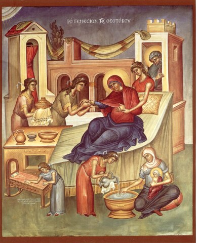 Ἡ γέννησίς σου Θεοτόκε, χαρὰν ἐμήνυσε πάσῃ τῇ οικουμένῃ, ἐκ σοῦ γὰρ ἀνέτειλεν ὁ Ἥλιος τῆς δικαιοσύνης, Χριστὸς ὁ Θεὸς ἡμῶν, καὶ λύσας τὴν κατάραν, ἔδωκε τὴν εὐλογίαν, καὶ καταργήσας τὸν θάνατον, ἐδωρήσατο ἡμῖν ζωὴν τὴν αἰώνιον.
