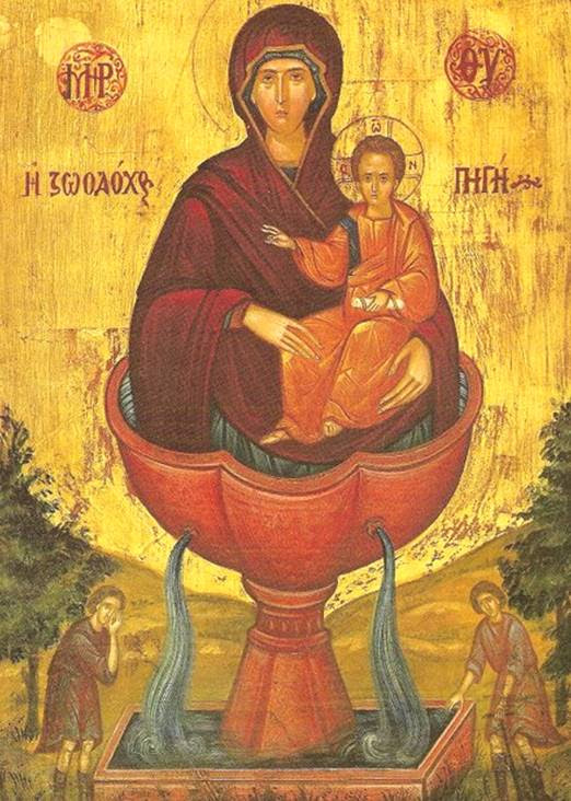 Τὸν ὑπερούσιον, ὄμβρον κυήσασα, πηγὴ ζωήρρυτος, Παρθένε πέφυκας, ἀναπηγάζουσα ἡμῖν, τὸ νέκταρ τὸ ἀθάνατον, ὕδωρ τὸ ἁλλόμενον, εἰς ζωὴν τὴν αἰώνιον, νάματα γλυκύρροα, ἐκ τῆς Κρήνης σου πάντοτε, ἐξ ὧν ἐπεντρυφῶντες βοῶμεν· Χαῖρε Πηγὴ ἡ ζωηφόρος.