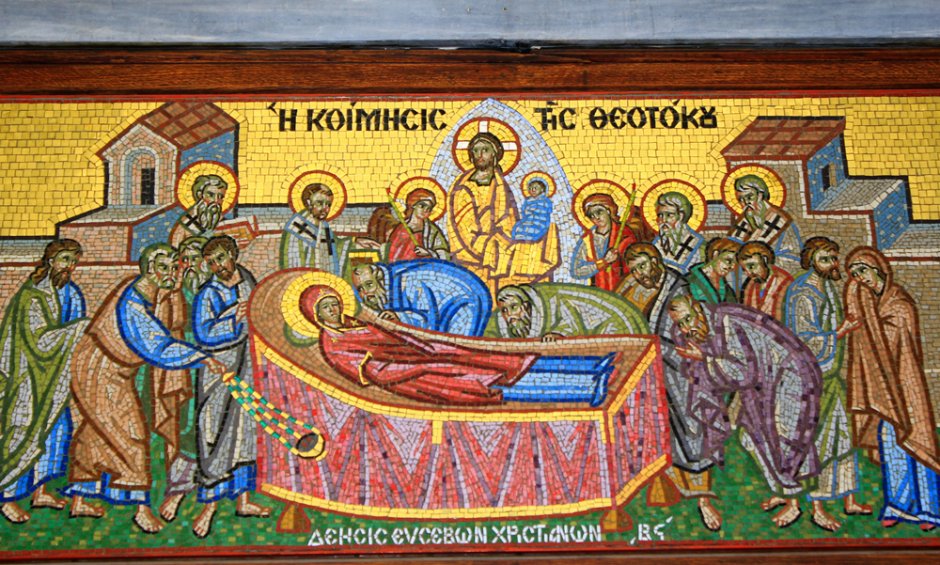 Τότε, ο κορυφαίος των Αποστόλων Πέτρος, άρχισε να εκφωνεί στην Θεοτόκο επιτάφια εγκώμια και οι λοιποί Απόστολοι πήραν το νεκροκρέβατο, ψάλλοντας ύμνους και κρατώντας λαμπάδες, οδήγησαν το θεοδόχο σώμα της Θεομήτορος στον τάφο, στην Γεσθημανή.