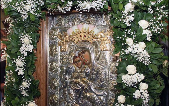 Θρόνος ἐπηρμένος πέλεις Ἁγνή, φέρουσα ὡς βρέφος, τὸν τὰ πάντα ἐν τῇ δρακί, φέροντα ὡς Κτίστην· ὑμνοῦμέν σου Παρθένε, τὴν ὄντως ὑπὲρ λόγον μεγαλειότητα.