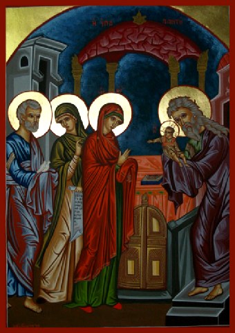 Σήμερον ἡ Πάναγνος Μαριάμ, τῷ Ναῷ προσάγει, ὥσπερ βρέφος τὸν Ποιητήν, ὃν ἐν ταῖς ἀγκάλαις, ὁ Πρέσβυς δεδεγμένος, Θεὸν αὐτὸν κηρύττει, κἂν σάρκα εἴληφε.