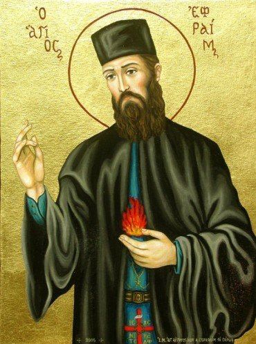 Ἀλλά πλήρου τά αἰτήματα ἑκάστοτε, τῶν πιστῶς σοί προσιόντων Ἐφραίμ Ἅγιε, καί βοώντων σοί• χαίροις Πάτερ μακάριε.