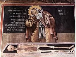 Θρηνώ και κλαίω όταν εννοήσω τον θάνατο και δω στους τάφους την δική μας ωραιότητα που πλάστηκε κατ εικόνα Θεού, χωρίς μορφή, χωρίς δόξα, χωρίς είδος. Πόσο μεγάλο θαύμα. Γιατί έγινε για εμάς αυτό το μυστήριο; Πως παραδοθήκαμε στην φθορά και συζευχθήκαμε με τον θάνατο. Αλήθεια αυτό έγινε με πρόσταγμα Θεού, όπως λέγει η Γραφή, ο οποίος παρέχει στους μεταστάντας την ανάπαυση.