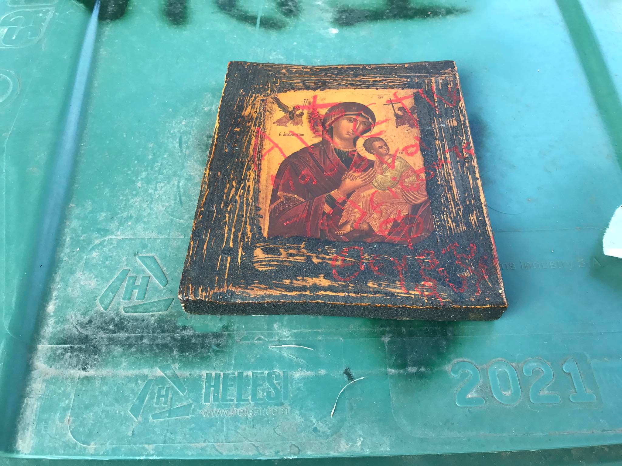 Αμέσως προσήλθαν οι κάτοικοι και ο κύριος Γιώργος Αλεφραγκής δήλωσε πως η εικόνα ήταν δική του την είχε τοποθετήσει εκεί στη μνήμη του γιου του που χάθηκε πέρυσι σε τροχαίο και ήταν βυζαντινή ενώ μας έστειλε και το πιστοποιητικό.