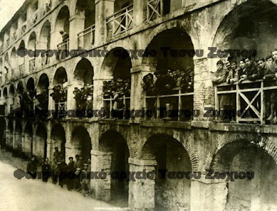 Μικρασιάτες πρόσφυγες ποζάρουν στην πίσω όψη των στρατώνων Pasqualigo στο Παλαιό Φρούριο της Κέρκυρας, 30 Αυγούστου 1923.