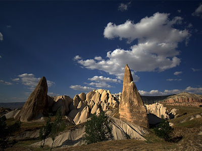 Και όταν καθίσεις καθώς πέφτει το βράδυ, και κοιτάξεις γύρω σου τους τόνους του φωτός να γλιστρούν πάνω στις καμινάδες νεραϊδών και στα πετροκομμένα μοναστήρια, έχεις την εντύπωση πως το τοπίο ολόκληρο πιάνει ένα ακίνητο χορό και στο νου έρχονται οι στίχοι του Σεφέρη που ταξίδεψε έζησε και εντυπωσιάστηκε από την περιoχή :
