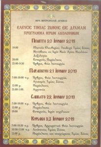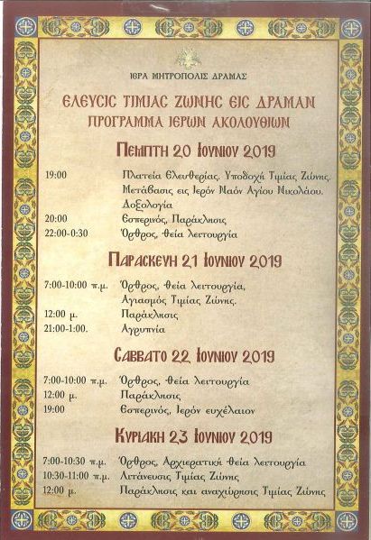 Εὐχαρίστως γνωρίζομεν εἰς τό χριστεπώνυμον πλήρωμα τῆς καθ’ ἡμᾶς ἱερᾶς Μητροπόλεως ὅτι ἀπό τό ἑσπέρας τῆς 20ῆς Ἰουνίου ἡμέραν Πέμπτην ἕως καί τήν Κυριακήν 23ην Ἰουνίου τήν μεσημβρίαν θά ἔχωμεν τήν εὐλογίαν τῆς ἐλεύσεως τῆς Τιμίας Ζώνης τῆς Ὑπεραγίας Θεοτόκου ἐκ τῆς ἱερᾶς Μεγίστης Μονῆς Βατοπαιδίου εἰς τόν ἱερόν ναόν Ἁγίου Νικολάου Δράμας, πρός εὐλογίαν καί ἁγιασμόν ἁπάντων ἡμῶν.