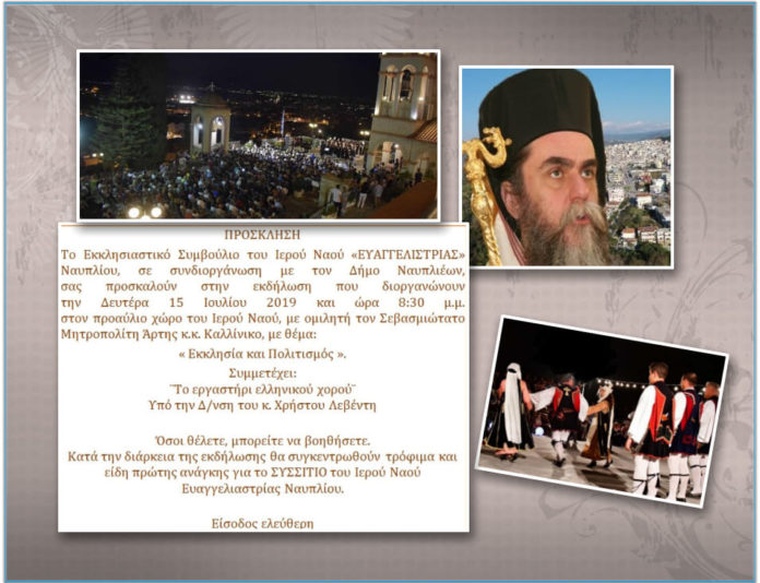 Το Εκκλησιαστικό Συμβούλιο του Ιερού Ναού «ΕΥΑΓΓΕΛΙΣΤΡΙΑΣ» Ναυπλίου, σε συνδιοργάνωση με τον Δήμο Ναυπλιέων, σας προσκαλούν στην εκδήλωση που διοργανώνουν την Δευτέρα 15 Ιουλίου 2019 και ώρα 8:30 μ.μ. στον προαύλιο χώρο του Ιερού Ναού, με ομιλητή τον Σεβασμιώτατο Μητροπολίτη Άρτης κ.κ. Καλλίνικο, με θέμα: