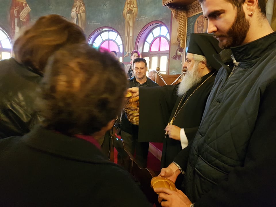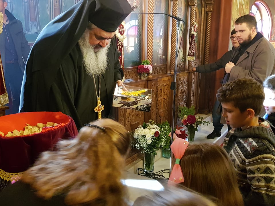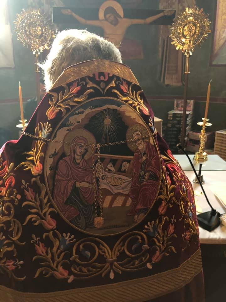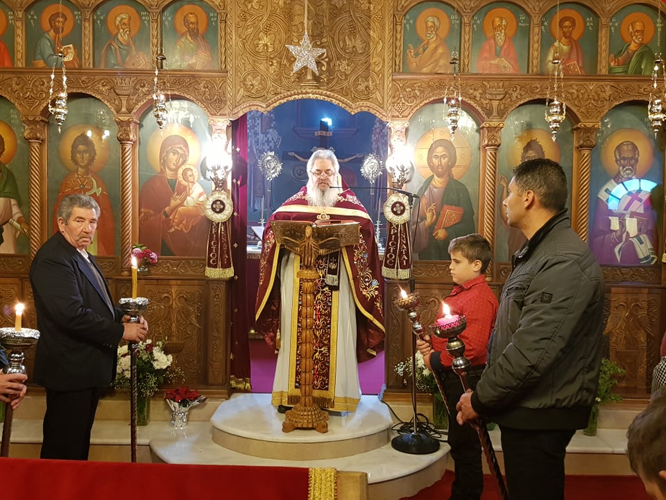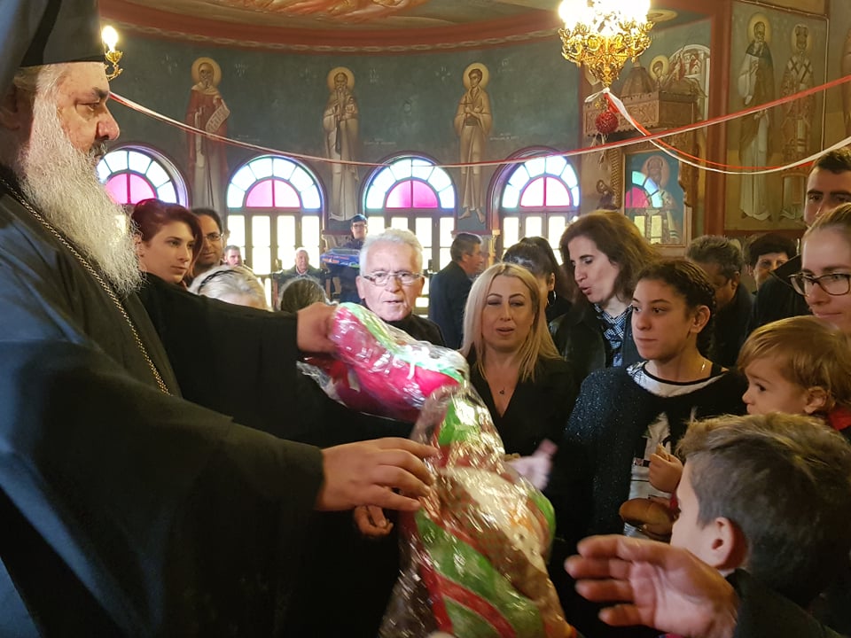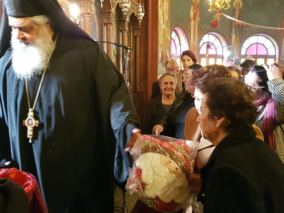 Μετά το πέρας της Θ. Λειτουργίας, αφού ευλόγησε τα Χριστόψωμα κατά το έθος, τα μοίρασε στον καθένα ξεχωριστά, «Άδοντες και ψάλλοντες εν τη καρδία, ο ποιμένας και οι ποιμενόμενοι, Ἡ γέννησίς σου Χριστὲ ὁ Θεὸς ἡμῶν, ἀνέτειλε τῷ κόσμῳ, τὸ φῶς τὸ τῆς γνώσεως, ἐν αὐτῇ γὰρ οἱ τοῖς ἄστροις λατρεύοντες, ὑπὸ ἀστέρος ἐδιδάσκοντο, σὲ προσκυνεῖν, τὸν Ἥλιον τῆς δικαιοσύνης, καὶ σὲ γινώσκειν ἐξ ὕψους ἀνατολήν, Κύριε δόξα σοι ! »