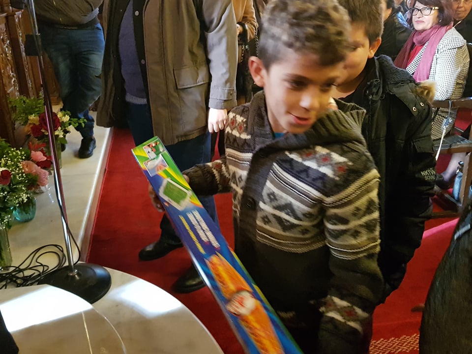Στην συνέχεια μοίρασε Δώρα στα παιδιά που εκκλησιάστηκαν αυτή την μεγάλη ημέρα, όπου πήραν πραγματική χαρά, όπως και στους μεγάλους που τελικά όλοι είναι και ήμαστε παιδιά, παιδιά του ίδιου Θεού ! Ακόμα και έξω από τον Ναό και σε αλλόθρησκους έδωσε ότι κρατούσε από Δώρα που με περίσσια χαρά δέχτηκαν και του ευχήθηκαν Χρόνια Πολλά !