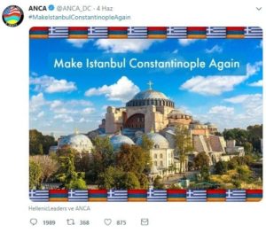 Πυρ και μανία ολόκληρος ο ελεγχόμενος από τον Ερντογάν, τουρκικός τύπος, μετά την δημοσιοποίηση φωτογραφίας στα κοινωνικά δίκτυα όπως το Twitter και της Αρμενικής Εθνικής Επιτροπής Αμερικής (ANCA), η οποία απαιτεί να γίνει η «Ινσταμπούλ» ξανά Κων/πολη, ενώ εμφανίζει ένα μεγάλο σταυρό πάνω από τον τρούλο της Αγίας Σοφίας, έχοντας γύρω από την φωτογραφία αρμενικές και ελληνικές σημαίες.